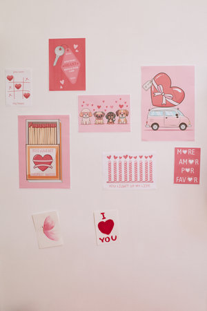 Valentines Day themed wall decorated with pink and red cards featuring hearts, romantic messages, illustrated car with bow, matchbox, cartoon dogs, feather, and I love you note