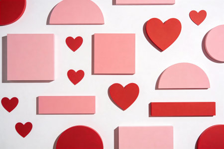 A vibrant composition of various geometric shapes and heart cutouts in shades of pink and red arranged against a clean white backdrop