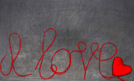 I love you. the inscription is made of red thread on a black chalkboard