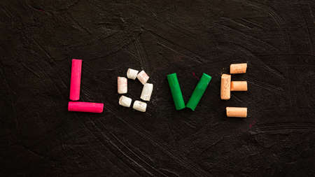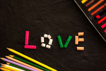 Multi-colored pastel crayons on a black background. The word Love is made of crayons. A symbol of love and unity. Extended horizontal banner. Creative layout of a Valentine's day greeting card.