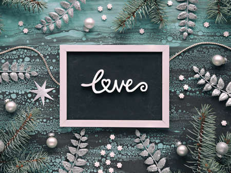 Christmas background with text Love. Xmas border with fir twigs, glass baubles and exotic fern leaves and light garland. Acrylic background in turquoise, brown. Flat lay, top view.
