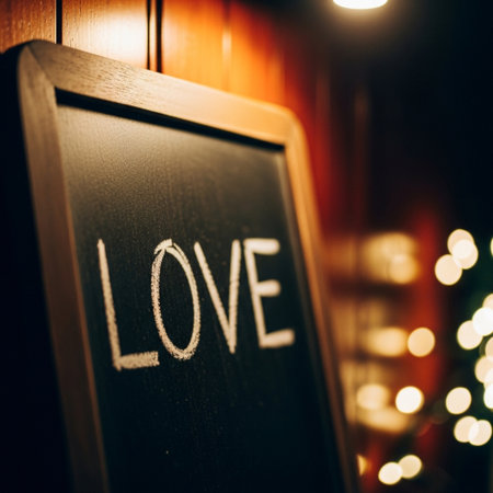 Love written on a black menu board in a restaurant with bokeh background