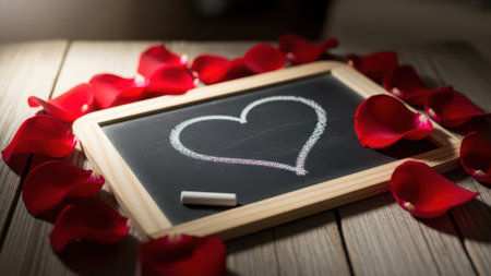 A chalkboard with a beautifully drawn heart in the center is surrounded by scattered red rose petals. The scene is set on a wooden surface, creating a romantic and intimate atmosphere. The simplicity of the chalk drawing combined with the natural beauty of the rose petals evokes feelings of love and affection.