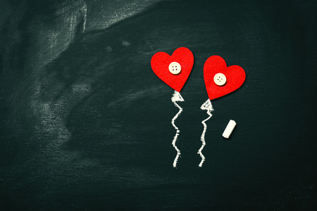 Creative Love or Valentine's Day Concept with Balloons in Heart Shape Form, Drawing on a Chalkboard. Horizontal with Copy Space