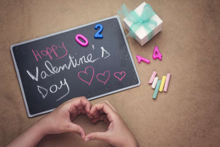 happy valentine's day writing on chalkboard and hand heart shape