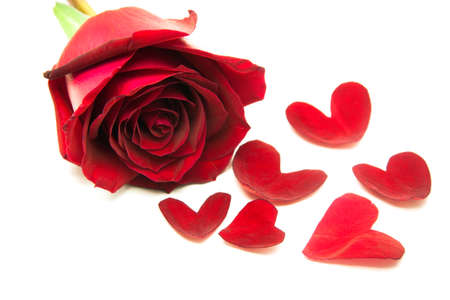 Close up of red rose and heart on white background