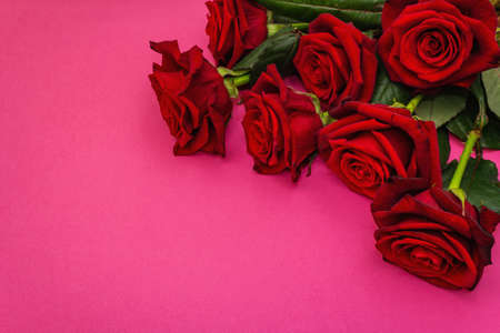 Bouquet of fresh burgundy roses on a matte pink background. Fragrant red flowers, gift concept for Valentine's Day, Wedding or Birthday, top view