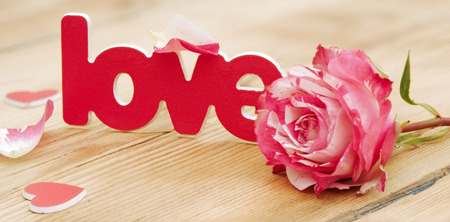 red-white rose and scattered flower petals and the word love on a rustic background
