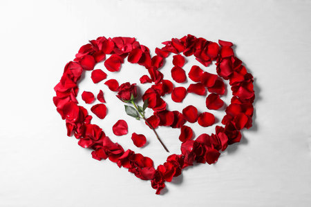 Honeymoon. Heart made with rose and petals on white background, top view