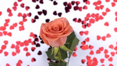 A close-up of red roses with heart-shaped confetti, symbolizing love and romance on Valentine's Day.