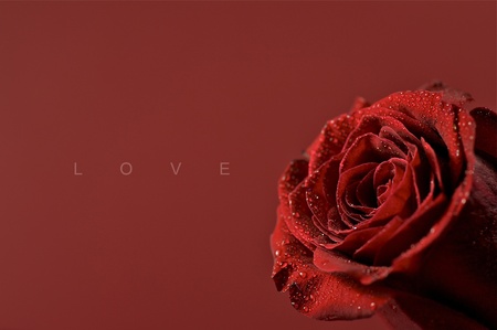 Floral background, flower of fresh wet rose with water drops, close up, macro. single one red rose, copy space. flora concept
