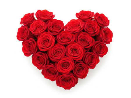 This image features a stunning heart shaped frame made of red roses, with a clean white background. The roses are intricately arranged to form a heart shape, creating a romantic and elegant visual effect. The image is perfect for Valentine's Day, anniversaries, or any occasion that requires a touch of love and affection.