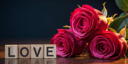 Three deep red roses are arranged with wooden blocks spelling LOVE on a polished wooden surface with a dark background.