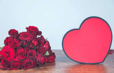red roses with red heart on wooden desk