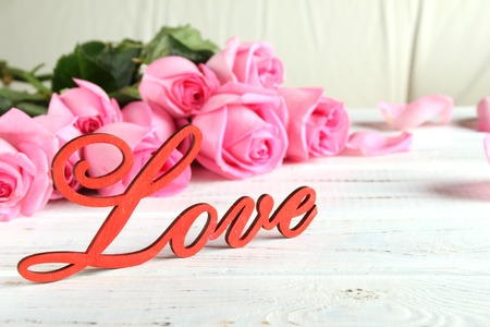 Pink roses and the word love on a white wooden background.