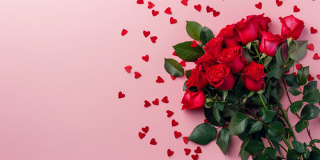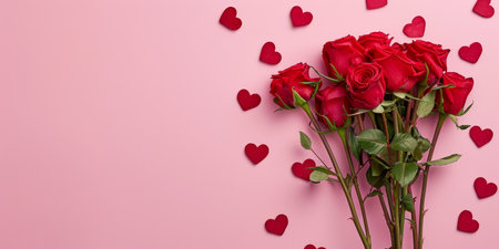 A stunningly beautiful bouquet of vibrant red roses is elegantly surrounded by heart confetti on a soft pink backdrop