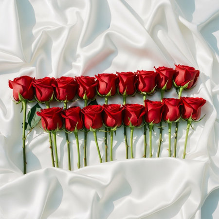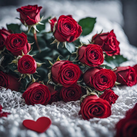 Fresh red roses laid across a white bed with soft lighting, evoking a peaceful and romantic atmosphere perfect for a cozy setting