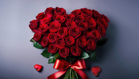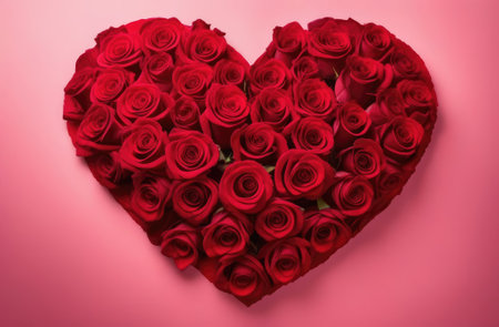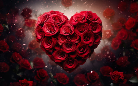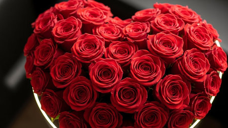 A heart-shaped arrangement of numerous deep red roses fills the frame, with soft light highlighting their velvety...