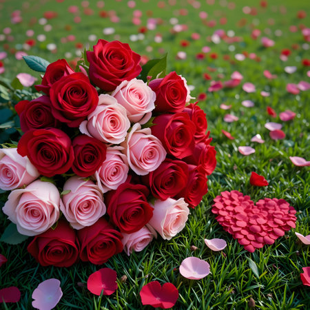Bouquet of red and pink roses on green grass with hearts