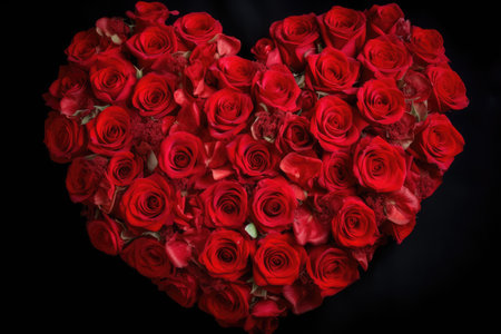 Top view of multiple red rose blossoms formed into a heart shape, romantic flower bouquet arrangement, symbolic love concept for mothers day or valentines day decoration