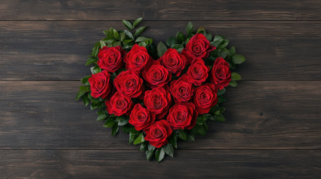 A stunning heart-shaped arrangement of red roses and green leaves on a dark, textured background, symbolizing romance, love, and passion.
