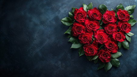 showing heart shape formed by vibrant red roses with green leaves on a dark textured background keywords:...