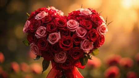 A heart-shaped bouquet of red and pink roses with a red ribbon against a blurred golden background.