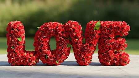 Love word sculpted from fresh red rose flowers outdoors