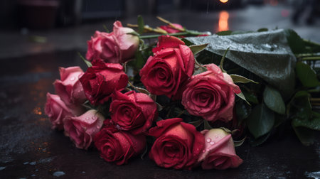 a greeting card with a top-down visual of a stunning red rose bouquet on a dark stone surface. The contrast between the rich red roses and the dark backdrop enhances the emotional impact