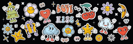Retro groovy sticker patch set, vector vintage funny mascot character kit, cartoon funny flower. Acid cute psychedelic cloud, pop comic rave doodle, funky nostalgic print. Hippy groovy sticker hands