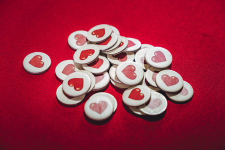 Gambling chips with hearts on red table background. Round shape. A lot of pieces. Health and live in game. Love symbol. Board game for children. In love concept. Immortal sign. High quality photo.