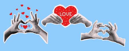 Hands making and holding heart shapes collage vector halftone illustration set. Valentine day celebration trendy design on blue background