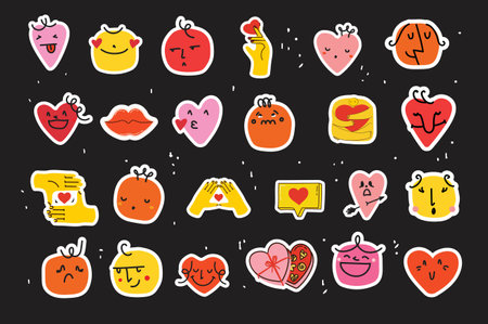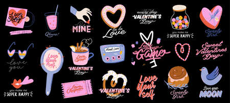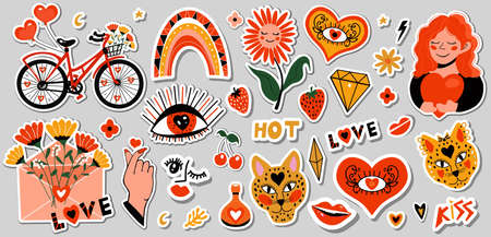 Big set of cool stickers love cartoon style, funny Comic character. Hot love flirting concept. Valentine s Day. Hand drawn. Trendy modern design. Sticker collection. Vector clip-art