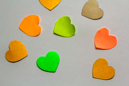 Valentine's day abstract background with cut paper colorful hearts on white.