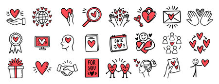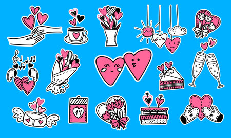 Set of Valentine's Day hand-drawn doodle stickers with simple engraving effect. Romantic mood cute love symbols and elements collection.