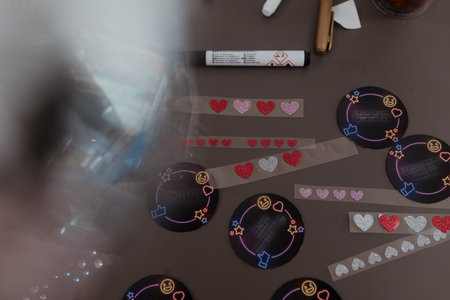 Glitter heart stickers placed near neon-style round labels with Cyrillic phrases arranged across craft desk during kids decoration activity featuring pens, tape, scattered materials.