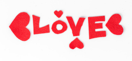 Beautiful inscription love on a white background, small red hearts. Postcard