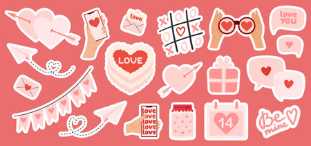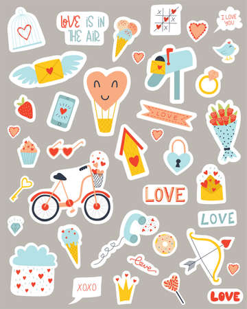 Valentine s day sticker pack. Love elements set. Hearts, gifts, sweets, cake, envelopes and other romantic symbols. Flat Vector illustration isolated
