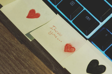 Sticky note with heart on laptop keyboard. Valentine's day concept