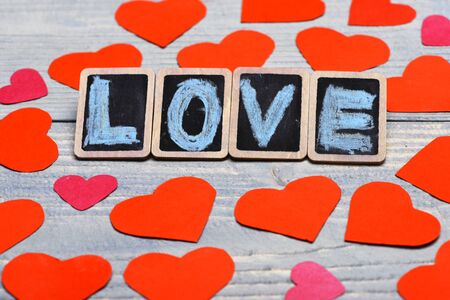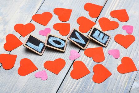 set of paper valentine red pink hearts with little black board with word Love on blue vintage wooden background