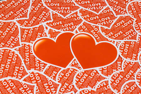 Valentines day, the word love is made of letters on a colorful bright background of many hearts. Declaration of love, mothers day, wedding day.