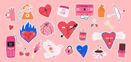 Hand drawn Valentines day sticker set, cartoon flat vector illustration isolated on pink background. Funky and quirky love elements - gift box, heart with face, old mobile phone, candle. 90s style.