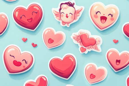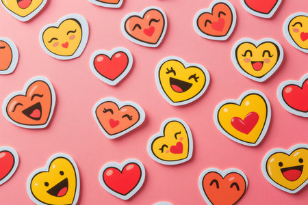Heart shaped emojis with various expressions of love, joy, and affection create a cheerful and romantic atmosphere on a pink backdrop