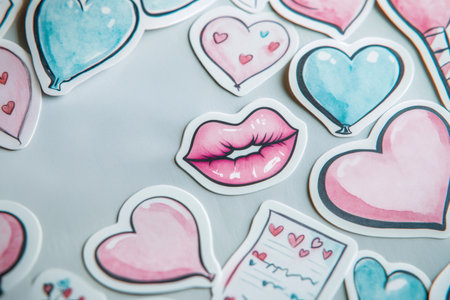 Watercolor stickers showing pink lips, hearts, love letters, and heart shaped balloons create a romantic atmosphere, perfect for valentine's day projects