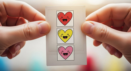 Close up of female hands holding card with happy and sad hearts on it