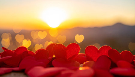 Numerous red hearts are scattered in the foreground with a vibrant sunset and mountain silhouette in the background, featuring bokeh lights.