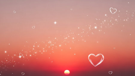 A soft sunset sky with heart-shaped bubbles and a trail of glittering stars. Clear details and vibrant colors ...