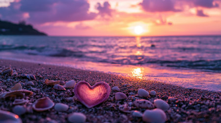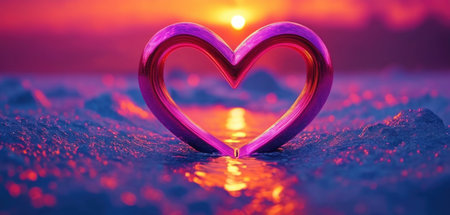 A heart is placed on the beach next to a body of water. The scene is serene and peaceful, with the sun setting in the background