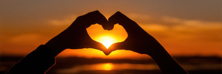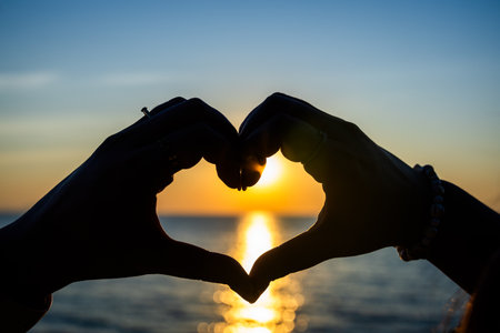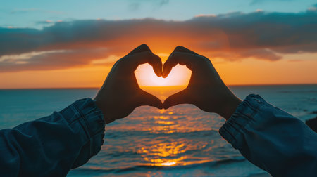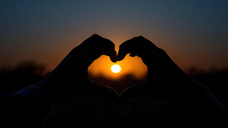 A silhouette of a couple's hands making a heart shape, perfectly framing the setting sun over the ocean. A beautiful, romantic symbol of love and togetherness.