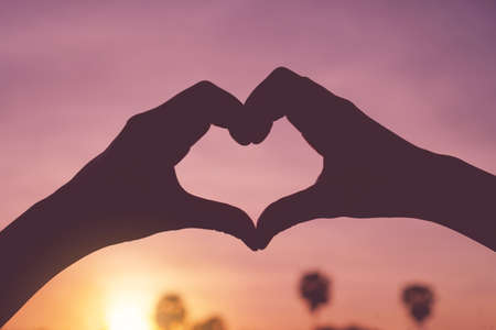 Beautiful Silhouette hand made heart shape on the sunset background.